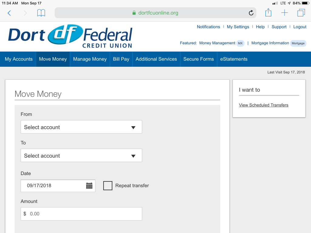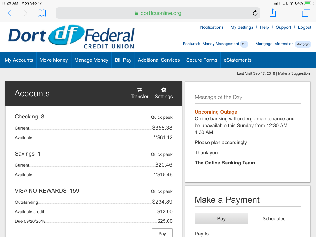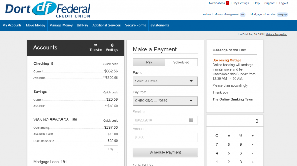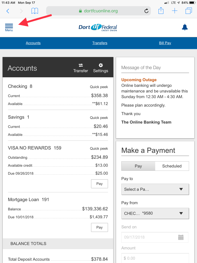 On Wednesday, September 26 you will notice some changes in the way that Dort Online Banking looks. On that day we are launching a new responsive design which scales and changes the size of Online Banking to fit whatever device you are using. Our goal is to make Online Banking look as good on your small laptop or tablet as it does on your desktop computer.