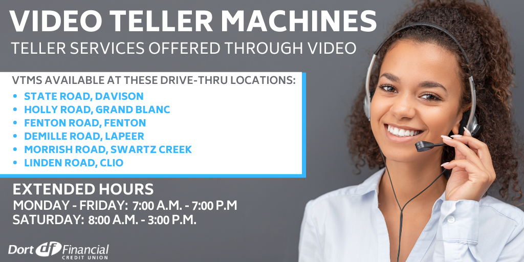 March 17, 2020: Video Teller Machines are an easy way to access your Dort Financial accounts from the following drive-thru locations: