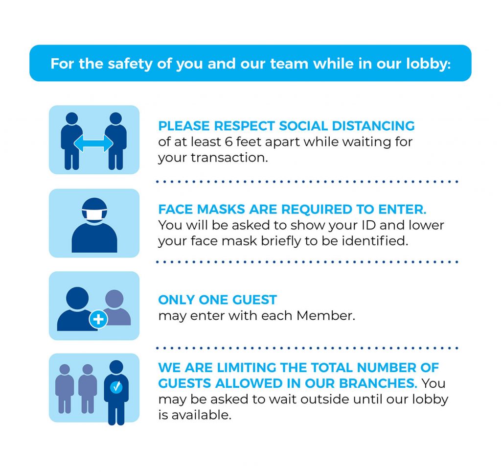 On Monday, June 15, 2020, we will open all our lobbies for member services by appointment only during regular business hours. You can make an appointment by phone, online or through our mobile apps. Teller services will continue to be offered only at our drive-thru lanes. We will continue with extended drive-thru hours for teller services. We encourage you to consider using our online and mobile banking apps to manage your accounts 24/7. For branch updates and hours of operation please visit our Branch/Service Access page.